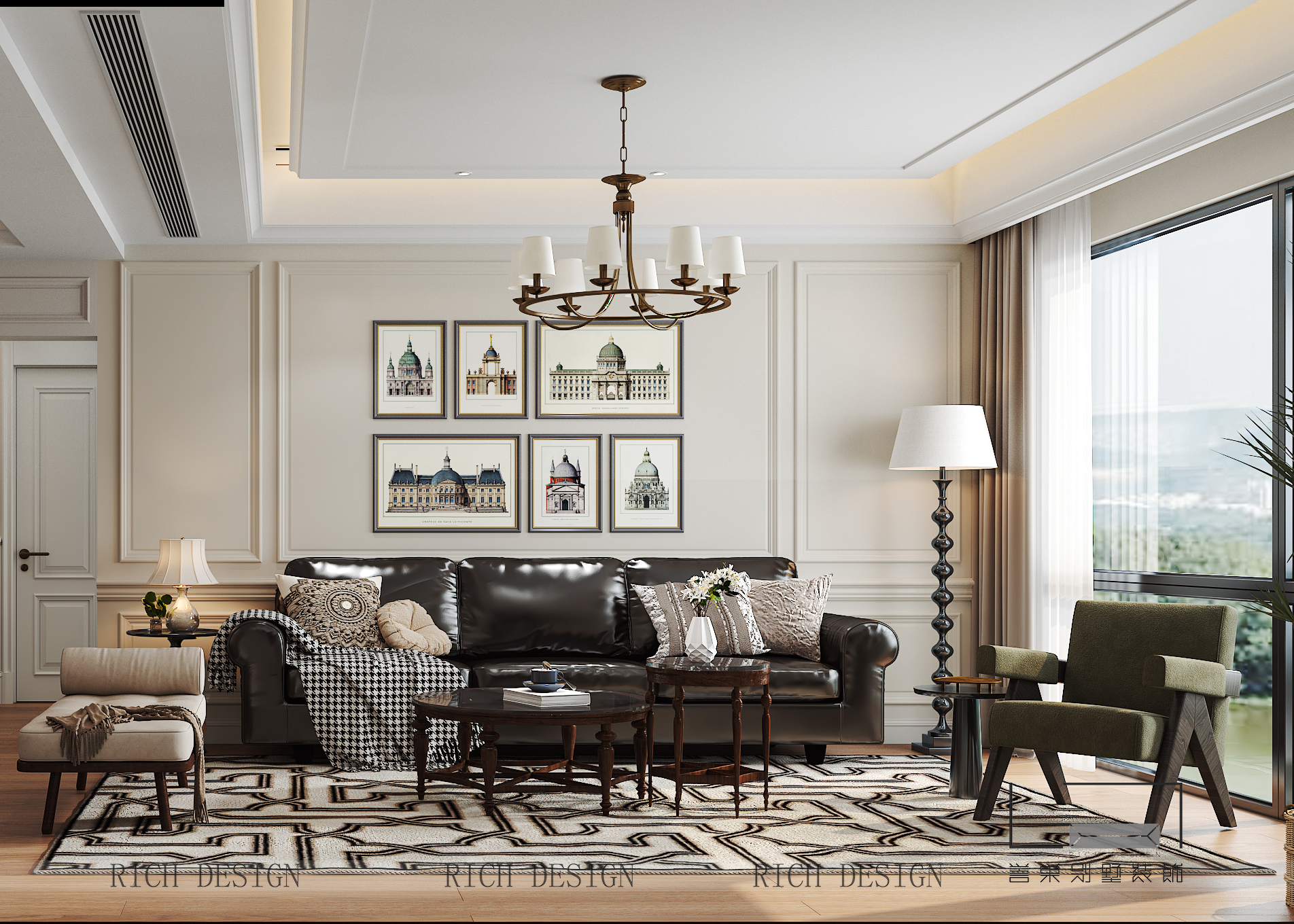 步入客厅,护墙板的立体线条率先勾勒出美式风格的仪式感,通过简洁的造型赋予空间现代呼吸感。配合复古吊灯,金属材质与白色灯罩的碰撞,在光影交错间营造出温馨而不失庄重的氛围。