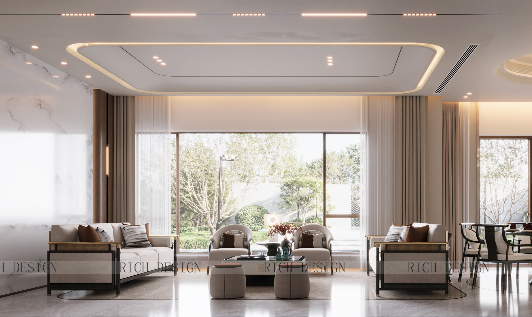 大理石与木作交织,于刚硬与温润间寻得平衡,不着痕迹地晕染出沉稳大气的格调。大面积落地窗如自然的画框,既能感受中式空间的含蓄静美,又能沉醉于阳光与自然交织的惬意时光。