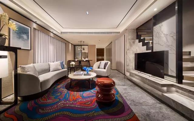 静谧中蕴含着浓浓的激情,在慵懒时光中流连于多元文化的碰撞。这里,你能体会到东方的文化底蕴,也能找到现代西方式的开放与热情。设计师在别墅装修设计时采用中西融合的现代设计风格,软装配色上多了一些色彩的跳跃,蓝紫与红橙的撞色,令人愉悦。