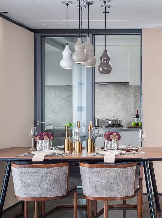餐桌上大大小小的彩色葫芦吊灯象征着果实和喜悦,以及光与影的趣味。厨房的ZK铸铁壶茶具,是传统手工与现代设计的完美融合。